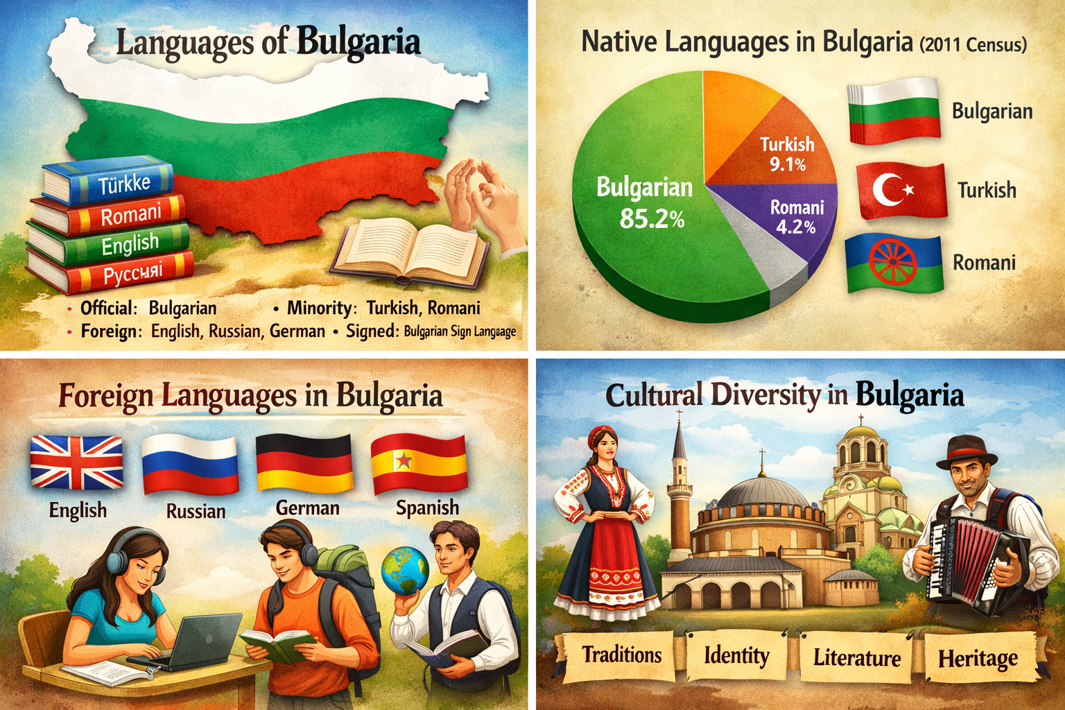 Have a look at how languages are used in Bulgaria, their historical roots, current statistics, and why multilingualism matters in Bulgarian society.